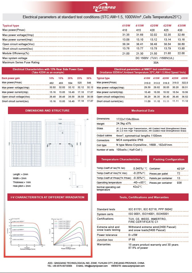 O módulo solar TopCon 450 W Full Black Bifacial possui uma potência nominal de 450 watts. Este módulo é ideal tanto para instalações residenciais e comerciais, como também para sistemas montados em solo. O módulo possui células monocristalinas que garantem alto desempenho e eficiência. Além disso, a sua construção robusta permite uma instalação segura e fácil. A tecnologia bifacial, juntamente com materiais de alta qualidade, proporciona uma elevada resistência a condições extremas de frio, calor, humidade e também a cargas mecânicas. O TopCon 450 Watt Full Black assegura uma geração de energia solar fiável e eficiente, mesmo em condições exigentes.