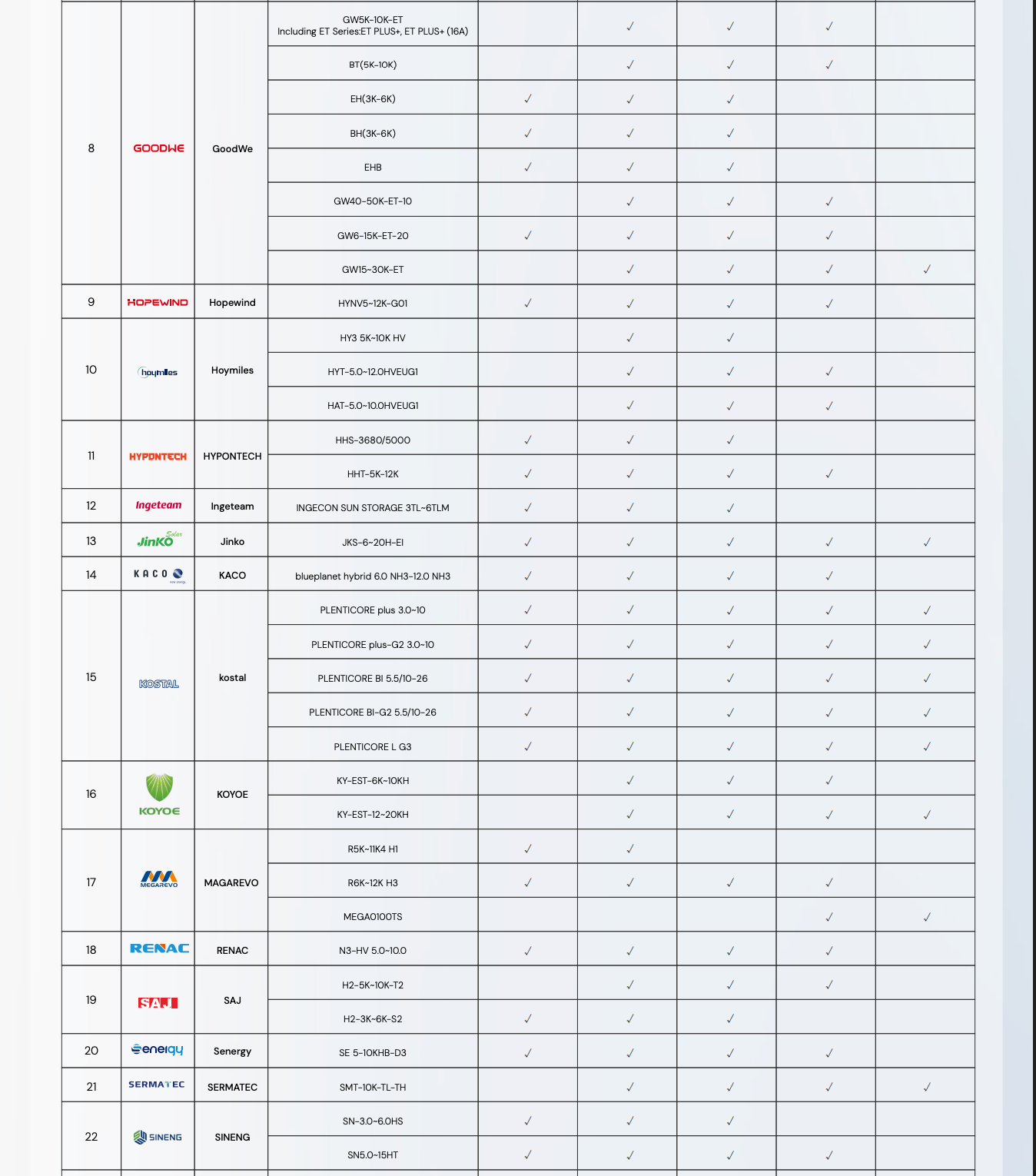 Compatível com a maioria dos inversores populares, incluindo Kostal, Goodwe, Kaco, Hoymiles, Deye, Solis, Growatt, entre outros.