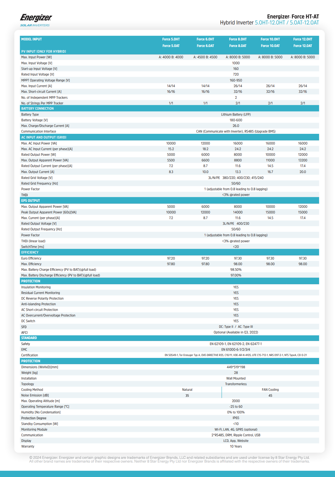 Energizer Force 12.0HT Inversor Híbrido + Armazenamento de Bateria Energizer 11,6 kW – by FOX ESS (H3E, ECS2900)