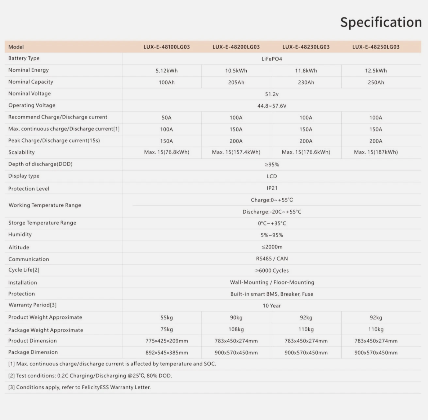 Felicity LUX-E-48200LG03 Bateria ESS 10,5 kWh com BMS Integrado