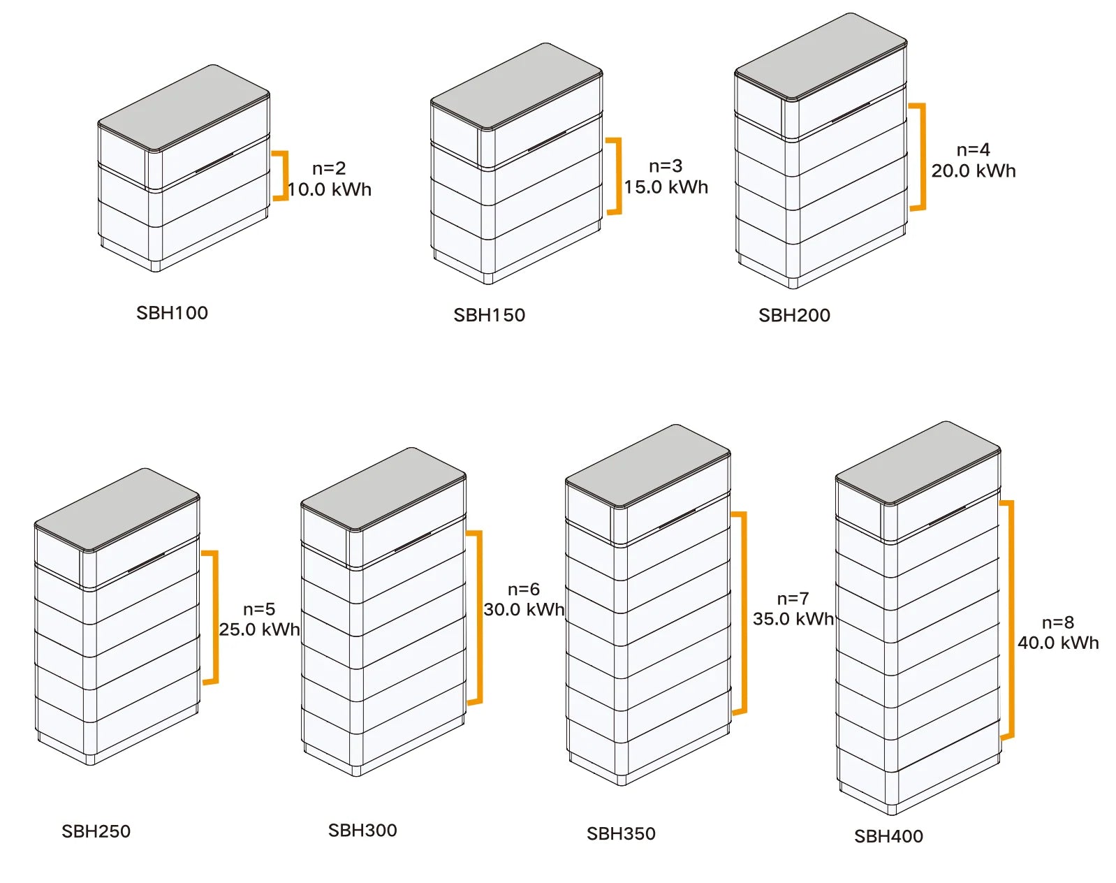 A SBH300 é composta por uma unidade base e seis módulos de bateria, que utilizam células prismáticas LFP (lítio ferro-fosfato).